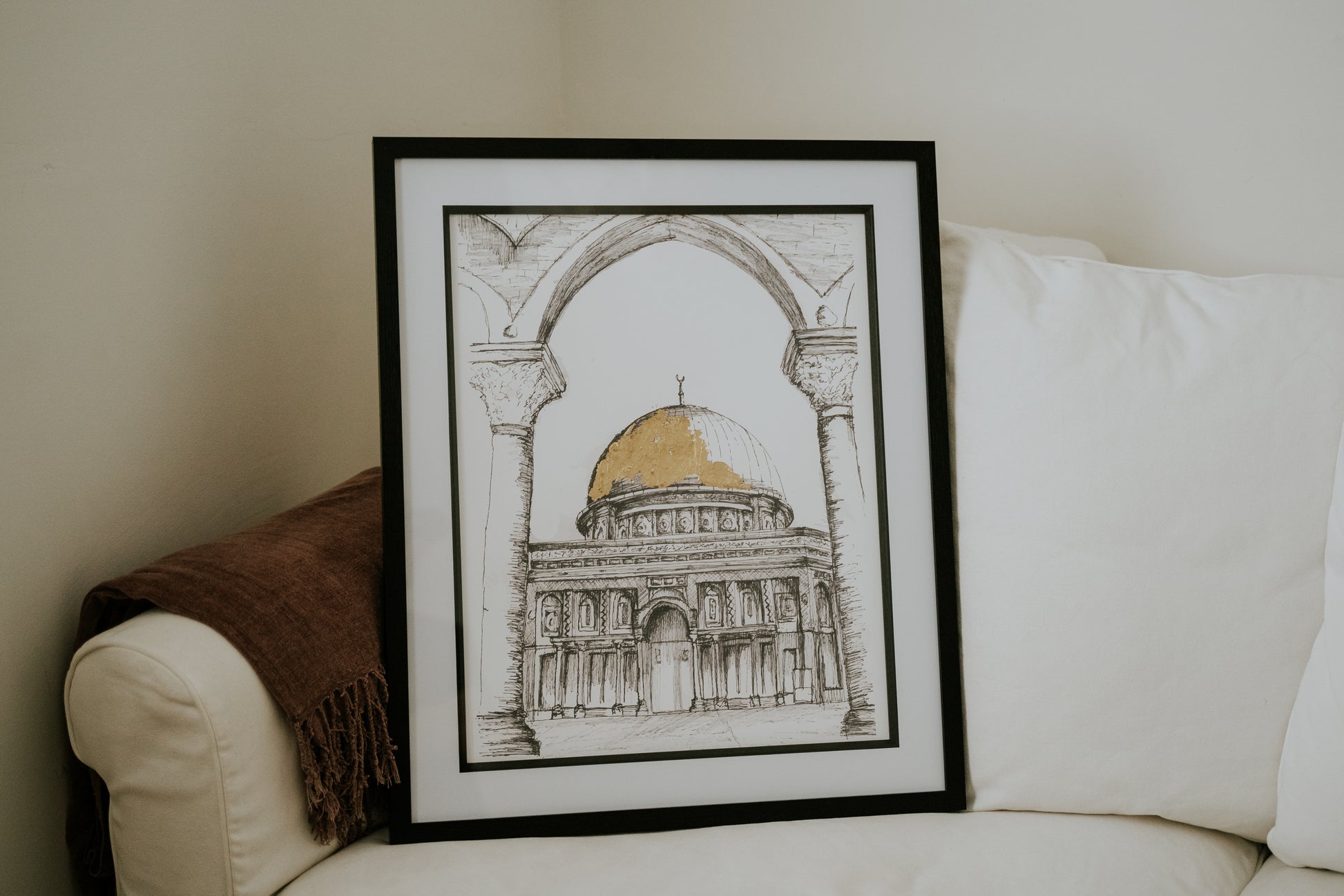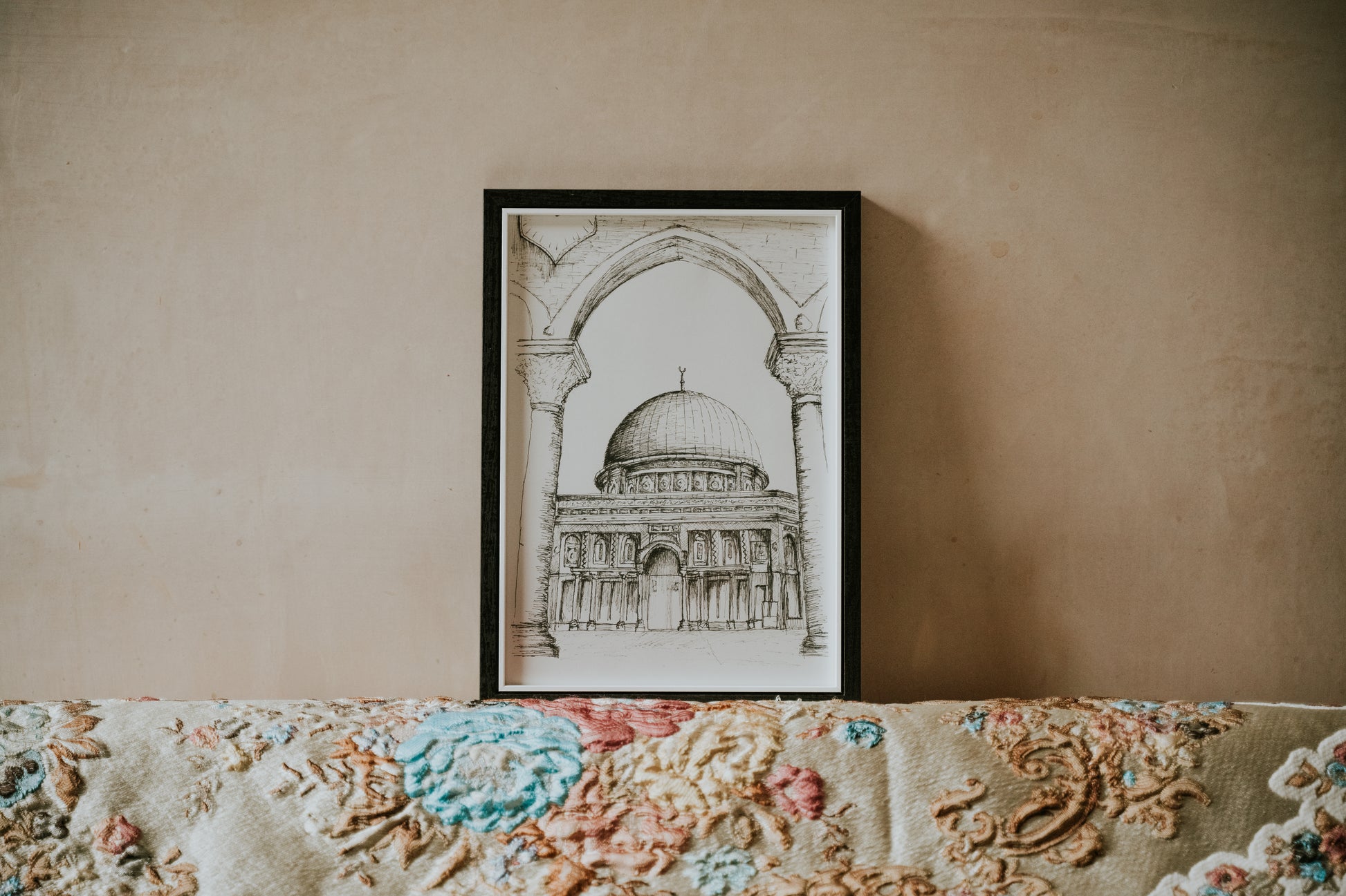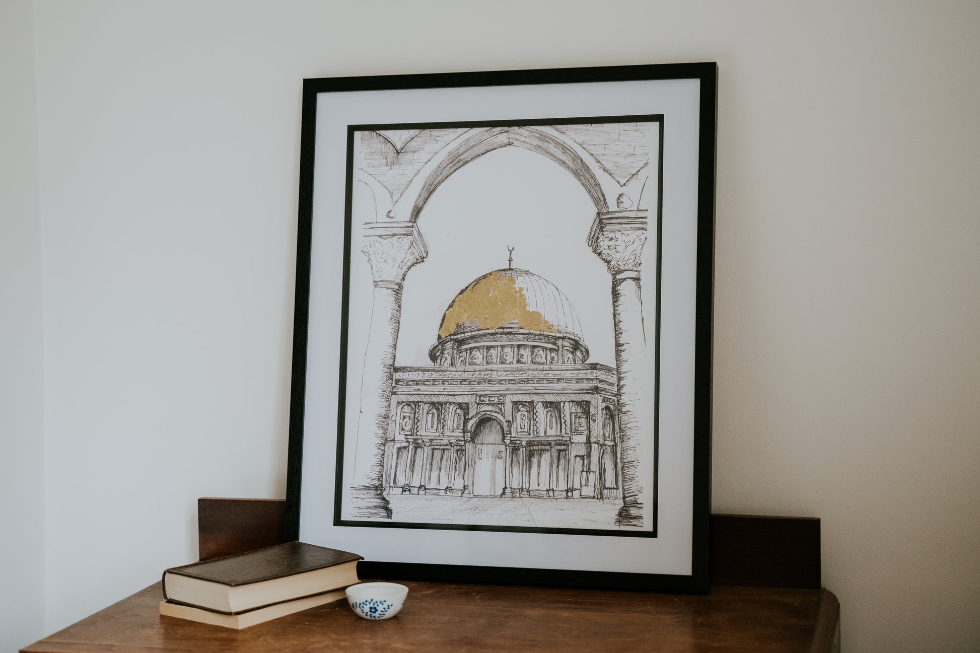 Introducing our A4 Framed Sketch of the Dome of the Rock in Jerusalem an exquisite piece of wall art designed to enhance the aesthetic of any room in your home. This minimal and modern style effortlessly complements various surroundings.