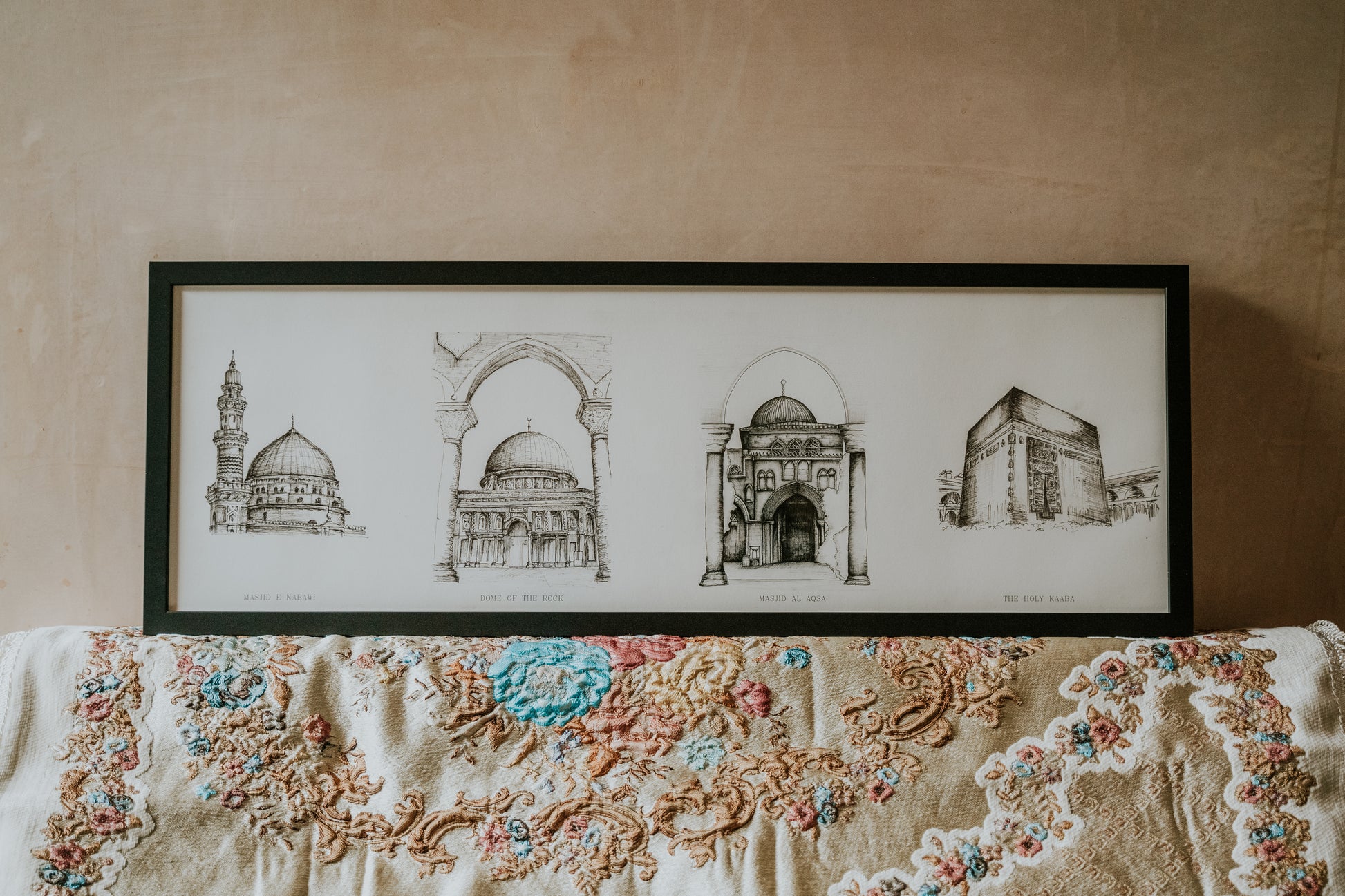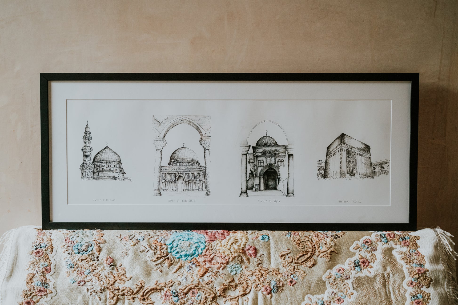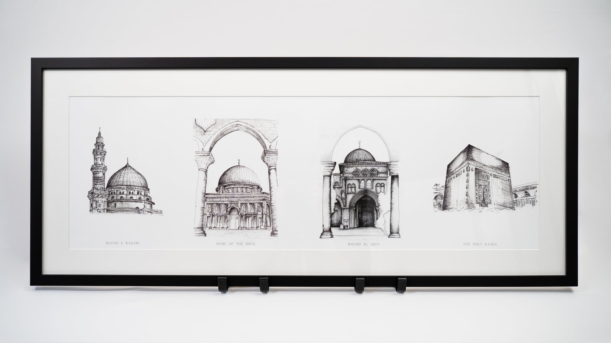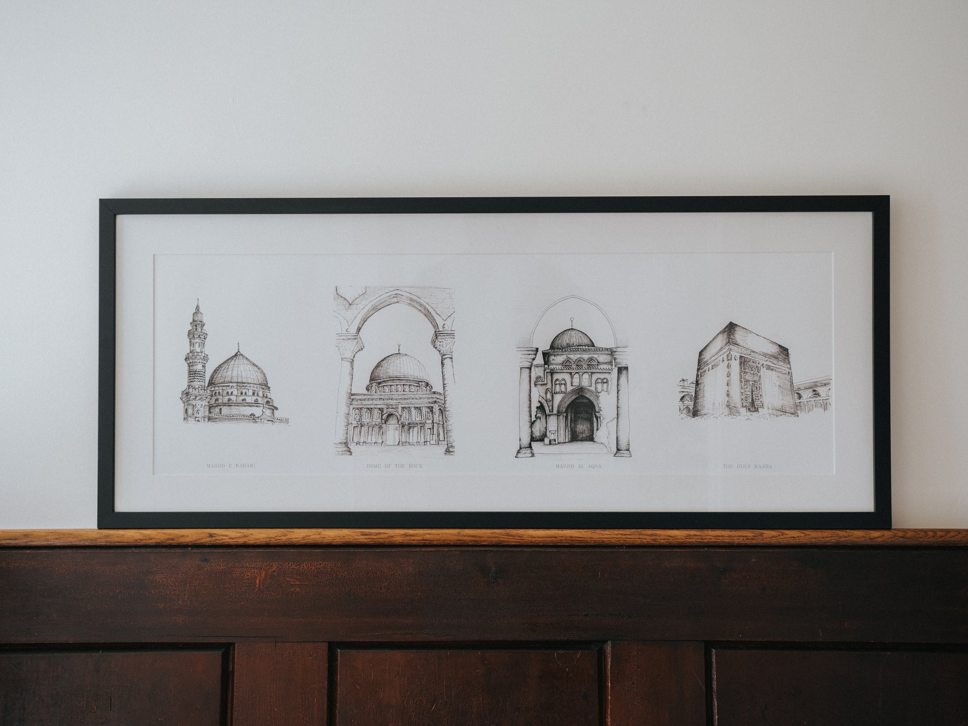Introducing our framed sketch the four major sites, The Holy Kaaba, Dome of The Rock, Masjid e Nabawi, and Masjid al Aqsa. All represented in one long drawing exquisite piece of wall art designed to enhance the aesthetic of any room in your home. This minimal and modern style effortlessly complements various surroundings.
