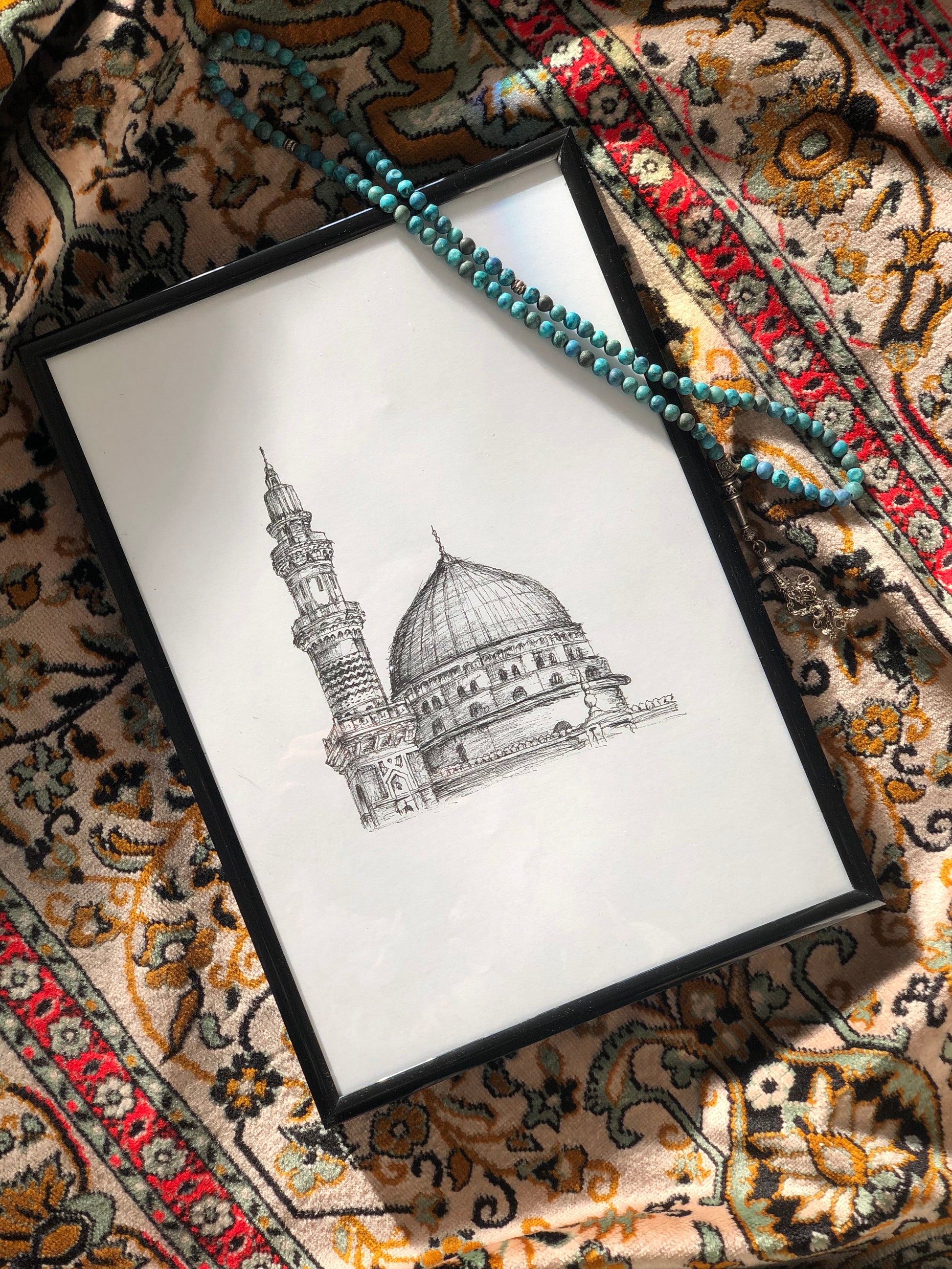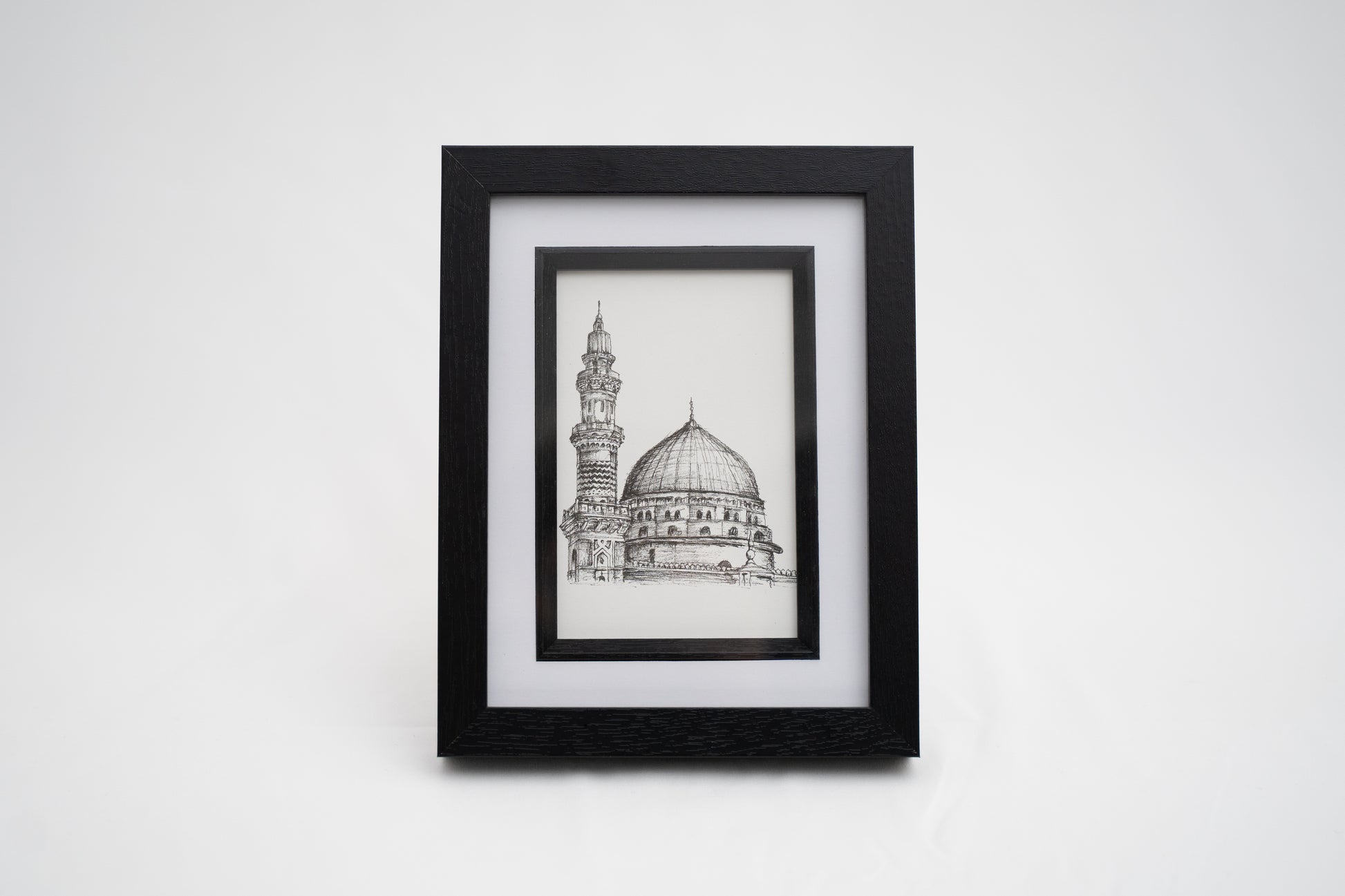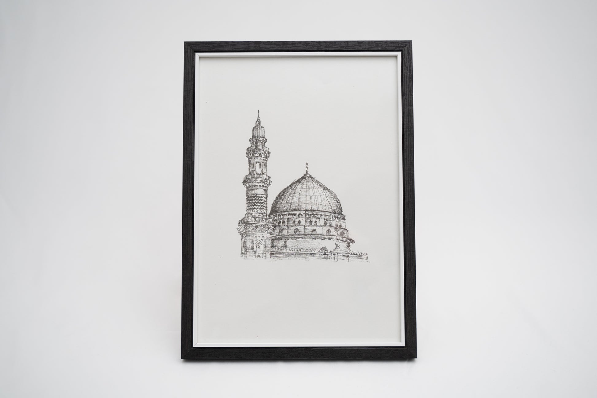 Introducing our framed sketch of Masjid e Nabawi an exquisite piece of wall art designed to enhance the aesthetic of any room in your home. This minimal and modern style effortlessly complements various surroundings.