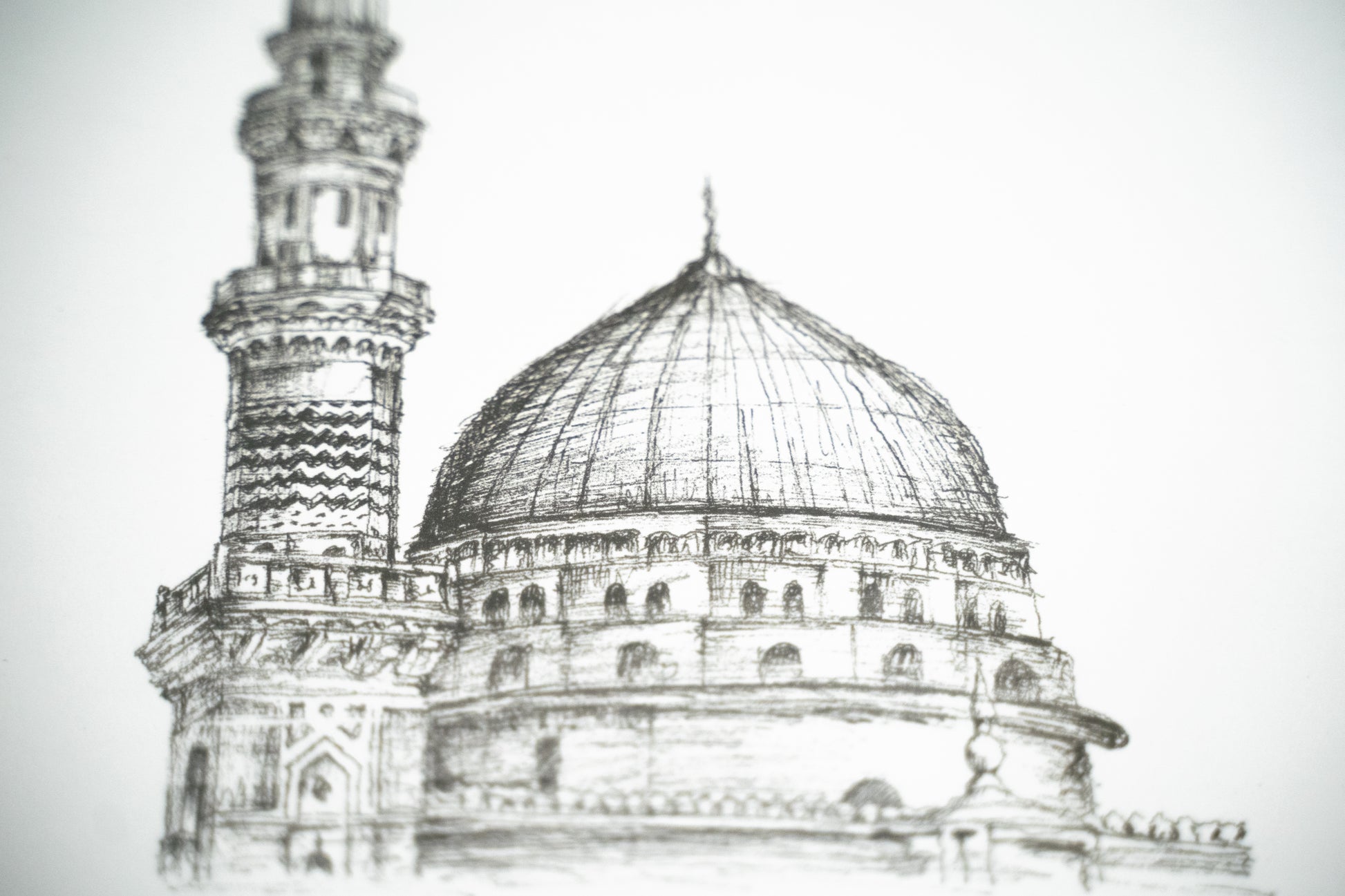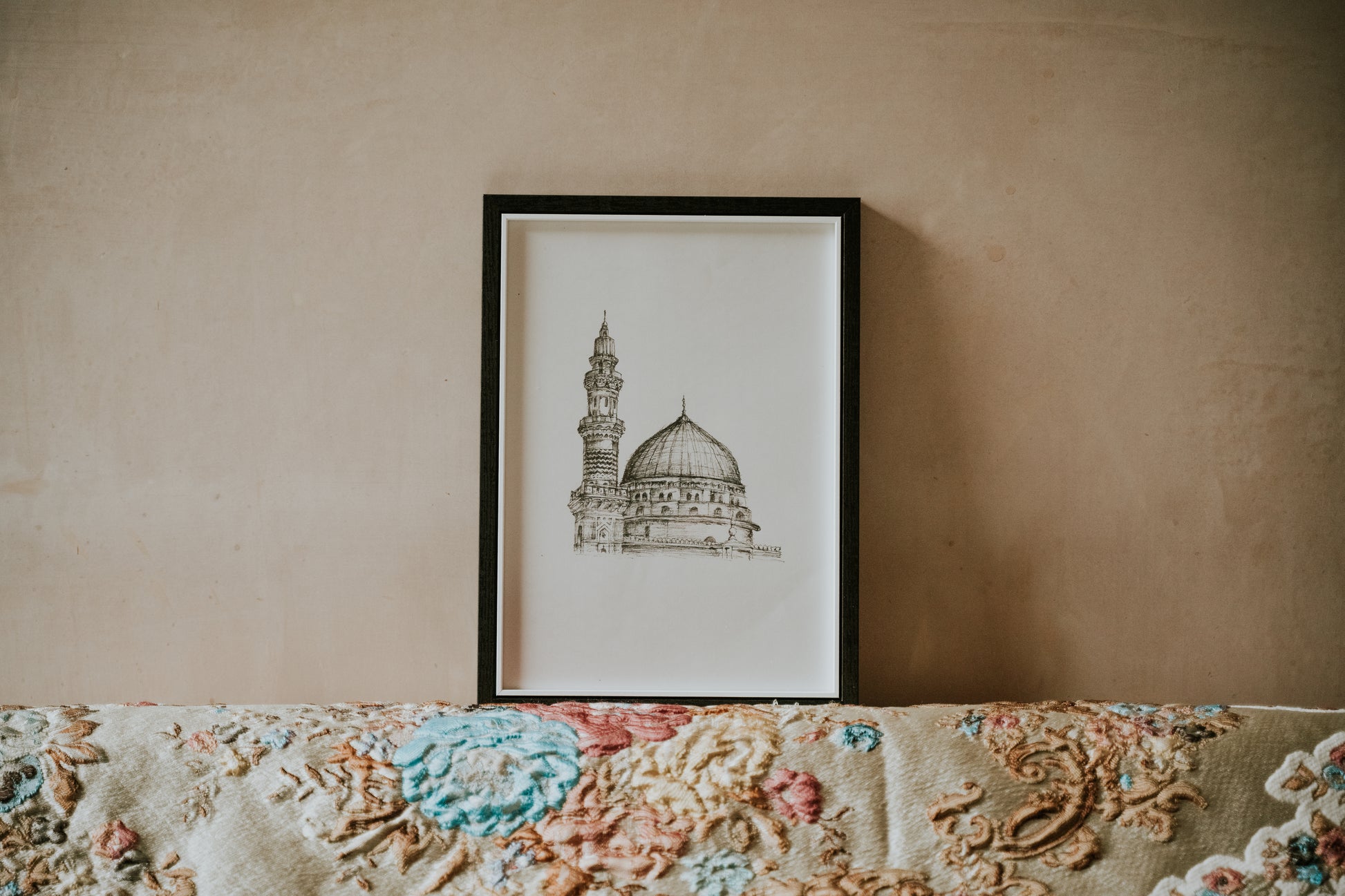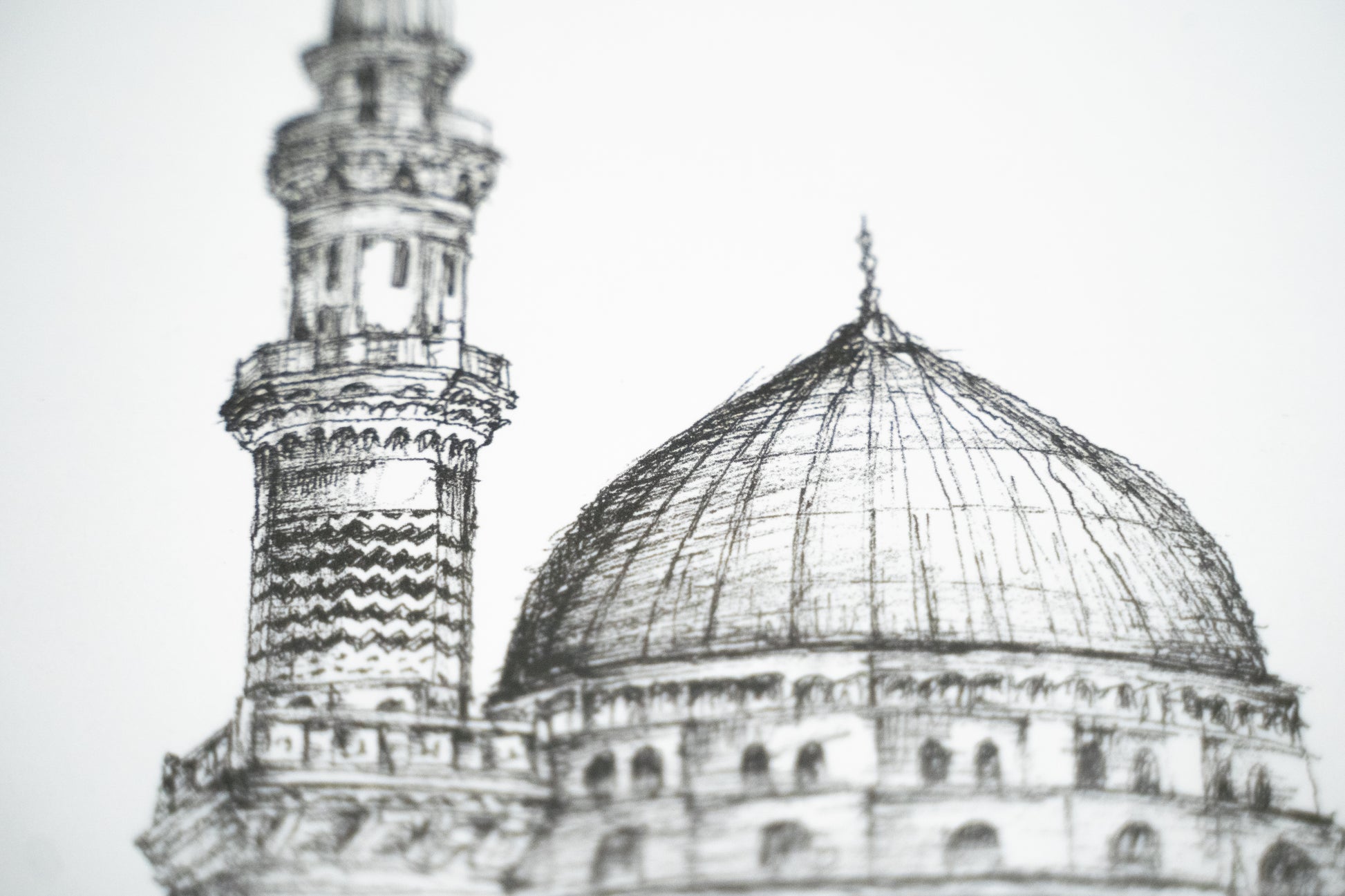 Introducing our framed sketch of Masjid e Nabawi an exquisite piece of wall art designed to enhance the aesthetic of any room in your home. This minimal and modern style effortlessly complements various surroundings.